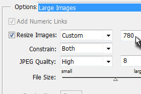Označite Resize Images in nato določite preko izbirnika na Custom. Velikost sem določil 780 pik, vi pa lahko poljubno. JPEG Quality nastavite na okoli 8. Ne zaprite še okna... |