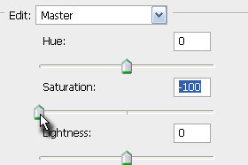 Sedaj pa drsnik pri polju Saturation povlecite na levo, da bo dobil vrednost -100 (glej sliko).