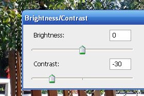 Kliknite sedaj zograj na Image, Adjustments in izberite Brightness/Contrast.... V novem oknu določite Contrast na -30 in potrdite na gumb OK. |
