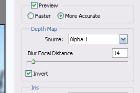 V novem oknu označite More Accurate in Source Alpha 1. Blur Focal Distance nastavite na 14 in označite Invert. Ne zaprite še okna... |