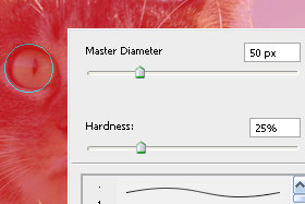 Kliknite z desnim miškinim gumbom na dokument in izberite poljubno velik Master Dimater (čopič) in hardness na okoli 25% (glej sliko).