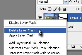 ![]() Kliknite na dodano masko (beli kvadtek desno od predogledne sličice) z desnim miškinim gumbom in izberite Delete Layer Mask. |