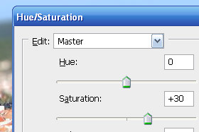 ![]() Pritisnite tipki CTRL + U in v novem oknu polje Saturation povečajte na +30 (glej sliko) in potrdite na gumb OK. |