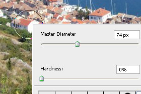 ![]() Kliknite z desnim miškinim gumbom na dokument in izberite poljubno velik Master Diameter (velikost čopiča) in Hardness 0% (glej sliko). |
