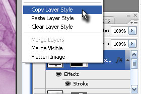 Sedaj pa kliknite z desnim miškinim gumbom na zgornji layer (kateremu ste ravnokar dodali efekt s črnim robom) in izberite Copy Layer Style. |