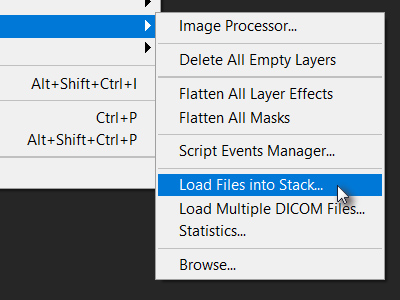 ![]() Odprite Adobe Photoshop, kliknite na File, Scripts in izberite Load Files into Stack...