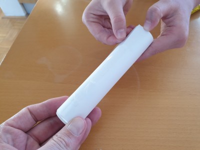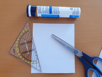 ![]() Papir zarežite tako, da bo ena stranica dolga toliko kot višina tulca, ki ste ga dobili pri šumečih tabletah. Druga stran papirja pa naj bo široka okoli 10 centimetrov. |