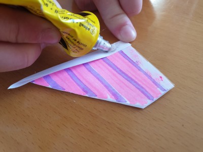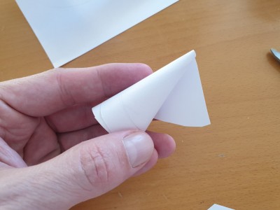 ![]() Ta drugi del zavihajte tako, da bo nastala špica (oziroma stožec). Potem pa ga zalepite, da se bo dobro držal skupaj. |