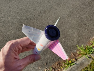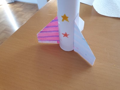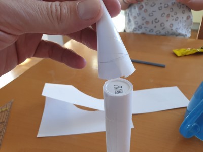 ![]() Špico rakete postavite na tulec in ga zalepite s salotejpom po robu. Pozor. Spodnji del mora biti tisti, ki ima odprtino in katero bomo lahko tudi zaprli s pokrovom. |