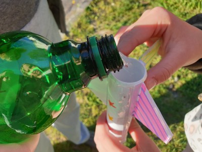 ![]() Vzemite dve šumeči tableti, jo razpolovite in dodajte v tulec z vodo. |