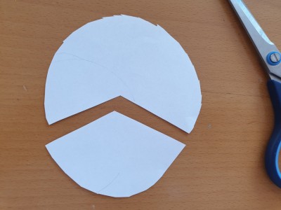 ![]() Iz papirja izrežite sedaj krog, ki ima premer okoli 11 centimetrov. Potem pa odrežite krog tako, da boste tretjino (krožnega izseka) pustili, drugo pa uporabili za vrh rakete. |