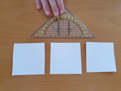 ![]() Vzemite papir in zarežite tri kvadrate, ki imajo stranico veliko 7 centimetrov. Kvadrat ima vse stranice enake, torej naj bo vsaka stranica dolga 7 centimetrov. |