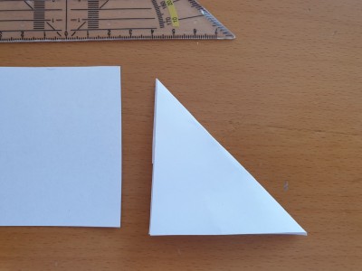 ![]() En izrezan list sedaj prepognite, da dobite trikotnik. Obe stranici, ki gresta lahko narazen, zlepite skupaj s salotejpom. |