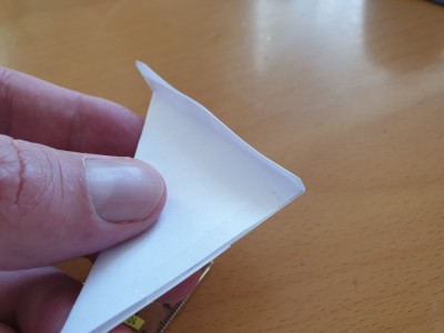 ![]() Potem pa krajšo eno stranico trikotnika malo zavihajte. Približno pol centimetra. Naredite še druga dva stabilizatorja (trikotnika) iz preostalih dveh izrezanih listkov. |