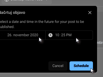 ![]() Nastavite datum in čas, ko želite, da se vaša objava prikaže na Facebooku in kliknite na gumb Schedule. Tukaj je potrebno paziti, da nastavite pravilni AM (dopoldne) ali PM (popoldne). V mojem primeru želim, da se objava prikaže ob 22:25, kar pomeni 10:25 PM. |