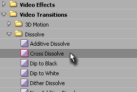 Nato pa v polju Effects kliknite na Video Transitions, Dissolve in držite z miško Cross Dissolve...