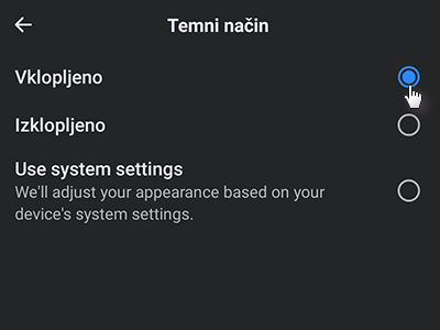 ![]() V novem oknu vklopite ali izklopite temni način. Če boste uporabili Use system settings, bo aplikacija povzela nastavitve, ki jih uporabljate za celotni sistem. |