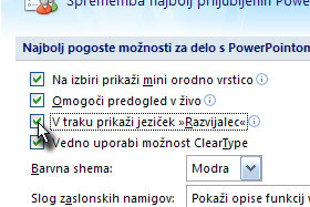V novem oknu označite V traku prikaži jeziček Razvijalec ter potrdite na gumb V redu.