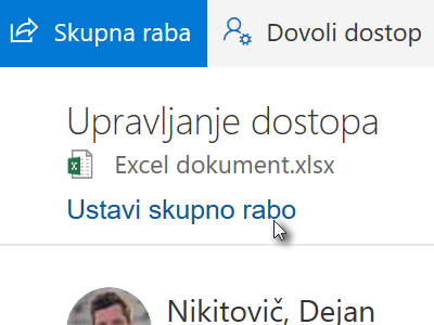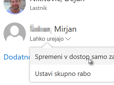 ![]() Prikažejo se vse osebe, s katerimi delite datoteko. Če želite, lahko nastavite, da imajo možnost urejanja, samo pogleda ali pa ustavite skupno rabo.