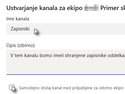 Samodejno dodaj kanal med priljubljene za celotno ekipo lahko označite, če želite imeti kanal bolje prikazan v Teams