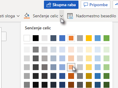 ![]() Kliknite na Senčenje celic oziroma na puščico navzdol in izberite poljubno barvo za ozadje.