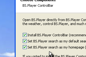Tukaj lahko sedaj izberete dodatne storitve. Prva opcija je namestitev BS.Player orodne vrstice v brskalnik. Preko te vrstice lahko glasbo ustavite, utišate, izberete pesem ... Druga možnost je izbira BS.Playerja kot privzet iskalnik v brskalniku, tretja možnost pa nastavi BS.Player stran za domačo stran v brskalniku. Ko izberete željene nastavitve pritisnite Next.