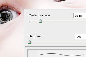Kliknite z desnim miškinim gumbom na dokument in nastavite veliko čopiča (Master Dimater) na malo manjšo velikost očesa in Hardness na 0% (glej sliko).