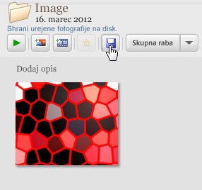 Ko urediš vse fotografije, se vrni v Nazaj v knjižnico in klikni na prazen prostor v mapi, v kateri si urejal fotografije, tako da ni izbrana le ena, ampak celotna mapa (lahko tudi izbereš vse fotografije, rezultat bo enak). Nato pa pod imenom mape klikni na gumb Shrani urejene fotografije na disk (lahko tudi Datoteka -> Shrani). V meniju Datoteka imaš še več drugih možnosti za izvoz fotografij (npr. izvažanje v drugo mapo, samodejno spreminjanje velikosti slik ob izvozu, dodajanje vodnega žiga ...).