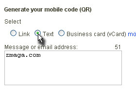 Lahko ustvarite povezavo na spletno stran, napis ali pa poslovno vizitko. Jaz sem označil Text in spodaj v polje napisal zmaga.com. |