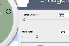 ![]() Kliknite z desnim miškinim gumbom na dokument in določite poljubno vrednost Master Diamater (velikost radirke) in Hardness na 30% (glej sliko). |