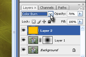 Potem pa layerju določite senčenje na Color Burn in Opacity okoli 70% (glej sliko). |