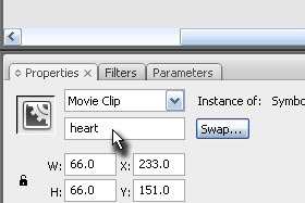 Pritisnite tipko F9 in v novo okno vpišite naslednjo kodo: for (k=0; k<30; k++) { duplicateMovieClip(this.heart, "heart"+k, k); } |