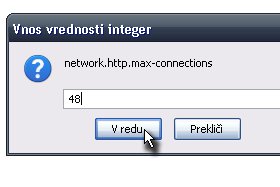 Napišite 0 in kliknite V redu. Zdaj vam bo Firefox hitreje odpiral strani (vedno). Če pa bi radi, da vam odpira strani še hitreje si poglejte lekcijo do konca. Predstavil vam bom program Speedy Fox, ki še bolj pospeši delovanje Firefox-a. |