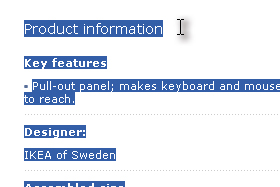 Jaz sem recimo odšel na spletno stran od podjetja Ikea in poiskal neki izdelek, ki se mi zdi zanimiv. Označite tekst kot kaže slika. Lahko označite naprimer specifikacije izdelka, kot sem jaz, ko sem si ogledal izdelek. |