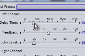 Delay Time: s številom milisekund določite koliko časa naj mine do odmeva Feedback: s procenti določite, koliko procentov označenega posnetka se naj ponavlja Echo level: s procenti določite, kako močen naj bo odmev Tako se lahko igrate posebej za levo in za desno stran zvoka. |