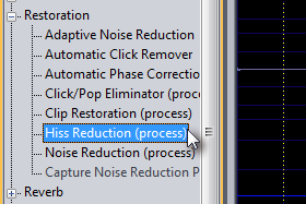 Če še niste zadovoljni s posnetkom, najprej označite celoten posnetek, nato pojdite med efekte, med Restoration, in izberite Hiss Reduction.