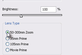 V novem oknu Lens Type določite 50-300mm Zoom in Brightness 100 % (glej sliko).