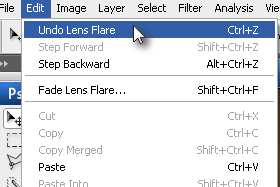 Zato bomo filter razveljavili tako, da kliknite zgoraj na Edit in izberete Undo Lens Flare. |
