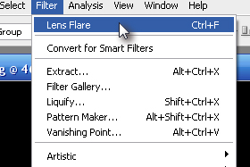 Kliknite zgoraj na Filter in izberite Lens Flare. Lahko uporabite tudi tipki Ctrl + F. |