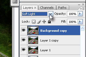 Zgornjemu layerju določite senčenje na Soft Light (glej sliko).