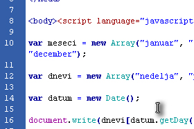 <script language="javascript"> var meseci = new Array("januar", "februar", "marec", "april", "maj", "junij", "julij", "avgust", "september", "oktober", "november", "december"); var dnevi = new Array("nedelja", "ponedeljek", "torek", "sreda", "cetrtek", "petek", "sobota"); var datum = new Date(); document.write(dnevi[datum.getDay()] + ", " + datum.getDate() + ". " + meseci[datum.getMonth()] + " " + datum.getFullYear()); document.write("<br>"); document.write(datum.getDate() + ". "+ (datum.getMonth()+1) + ". " + datum.getFullYear()); </script> Vnesli smo Javascript kodo za datum. |