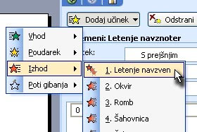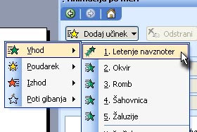 Kliknite na gumb Dodaj učinek ter izberite Vhod in Letenje navznoter. |