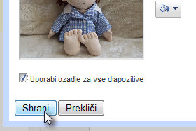 Označite Uporabi ozadje za vse diapozitive, da boste sliko nastavili na vse diapozitive na predstavitvi. Kliknite na gumb Shrani. |