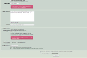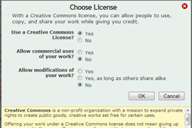![]() Use a Creative Commons License?Tukaj vključimo uporabo licence. Allow commercial uses of your work? Ta možnost dovoljuje, da se naš izdelek lahko uporablja v komercialne namene. Allow modifications of your work? Tukaj izberemo, ali lahko ostali predelujejo naše delo. Če izberemo Yes, as long as other share alike, potem morajo vsi, ki bodo sliko predelali, le-to objaviti pod enako licenco, kot je ta. Kliknite OK, nato pa Submit |