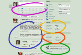 Tukaj vnesemo opis našega izdelka, napišemo lahko, koliko časa smo porabili, zakaj smo si izbrali to ... karkoli v zvezi s tem izdelkom. Keywords Ključne besede - vpišemo nekaj besed, ki se nanašajo na izdelek, in s katerimi bodo uporabniki lažje našli naš izdelek. Deviation Options Tukaj lahko vključimo ali izključimo možnost, da uporabniki komentirajo naš izdelek. Contains mature content Če je izdelek neprimeren za mlajše (golota, nasilje, kletvice ...), označimo eno izmes možnosti Yes, nato pa označimo, kakšno neprimerno vsebino vsebuje. Yes [strict] - izdelek bodo lahko videli samo člani, starejši od 18 let. Yes [warning] - mlajšim od 18 let se bo prikazalo opozorilo, a bodo vseeno lahko videli izdelek Creative Commons Našemu izdelku lahko postavimo tudi licenco, ki ostalim pove, kako lahko izdelek uporabljajo. Kliknimo na Choose License ... Več o neprofitni organizaciji Creative Commons si lahko preberemo na njihovi strani. |