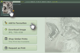 Dodali smo naš prvi izdelek :). Sedaj pride na vrsto malce brskanja po vseh slikah. Odprite domačo stran in nekaj vpišite v iskanje (naslov vašega najljubšega filma, ime kakšnega igralca, karkoli ...). Odprite nek izdelek, tako da kliknete nanj. Če nam je izdelek všeč, ga lahko dodamo med priljubljene. To lahko storimo tako, da kliknemo Add to Favourites gumb, ki se nahaja na desni strani. Sliko pa lahko enostavno primemo in odnesemo proti vrhu ekrana. Pokazal se bo črni trak in "mapa" Favourites. Sliko tam spustimo in prav tako smo jo dodali med priljubljene.
