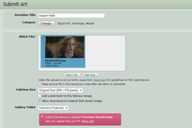 Deviant Title Naslov našega izdelka Category Kategorija, v katero spada naš izdelek. Sam sem se na začetku zelo lovil pri teh kategorijah, saj jih je res veliko in je treba dobro pogledati. Which File? S klikom na gumb Add a File... dodamo naš izdelek Fullview Size Ko uporabnik pregleduje vašo sliko, najprej vidi pomanjšano verzijo, ko klikne na sliko, pa se mu prikaže večja različica. Pri tej možnosti lahko izberete, kako velika bo večja različica. Če označite Add watermark to the fullview image, se bo na veliko različico slike dodal vodni žig, z logotipom deviantArta in vašim imenom. Če označite Allow download of original (full-sized) image, bodo uporabniki lahko prenesli sliko v originalno naloženi različici. Gallery Folder Ker zaenkrat še nismo dodajali nobenih kategorij v naši galeriji, imamo tukaj samno možnost Submit to Featured. |
