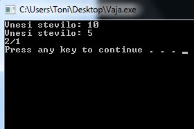 int c, d; /*definiramo dve spremenljivki tipa "int"*/ printf("Vnesi stevilo: "); /*program od nas zahteva vnos imenovalca */ scanf("%d", &c); /*število, ki smo ga zgoraj vnesli se shrani v spremenljivko "c"*/ printf("Vnesi stevilo: "); /*program od nas zahteva vnos imenovalca*/ scanf("%d", &d); /*zgoraj vneseno število se shrani v spremenljivko "d"*/ |
