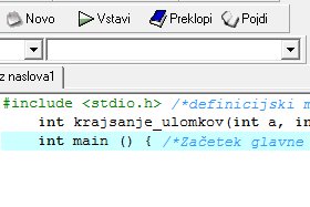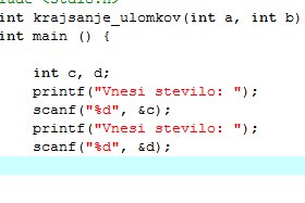 V dokument kopirajte naslednji del kode: #include <stdio.h> /*definicijski modul*/ int krajsanje_ulomkov(int a, int b); /*prototip fukncije*/ int main () { /*Začetek glavne funkcije (main function)*/ |