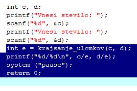 ![]() Nadaljujte s tem: int e = krajsanje_ulomkov(c, d); /*klic funkcije "krajsanje_ulomkov"*/ printf("%d/%d\n", c/e, d/e); /*izpis rezultata*/ system ("pause"); return 0; } |
